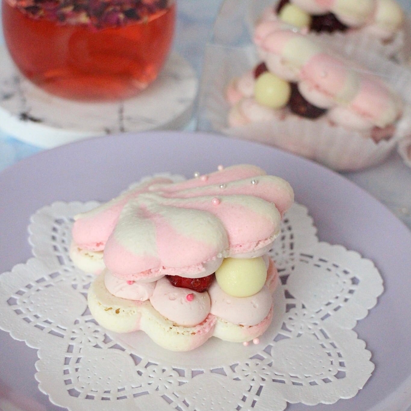 卵白(卵を含む)、砂糖、アーモンドパウダー、クリームチーズ、バター、ドライストロベリー、チョコレート(乳成分・大豆を含む)、食用色素(赤色3号 )
